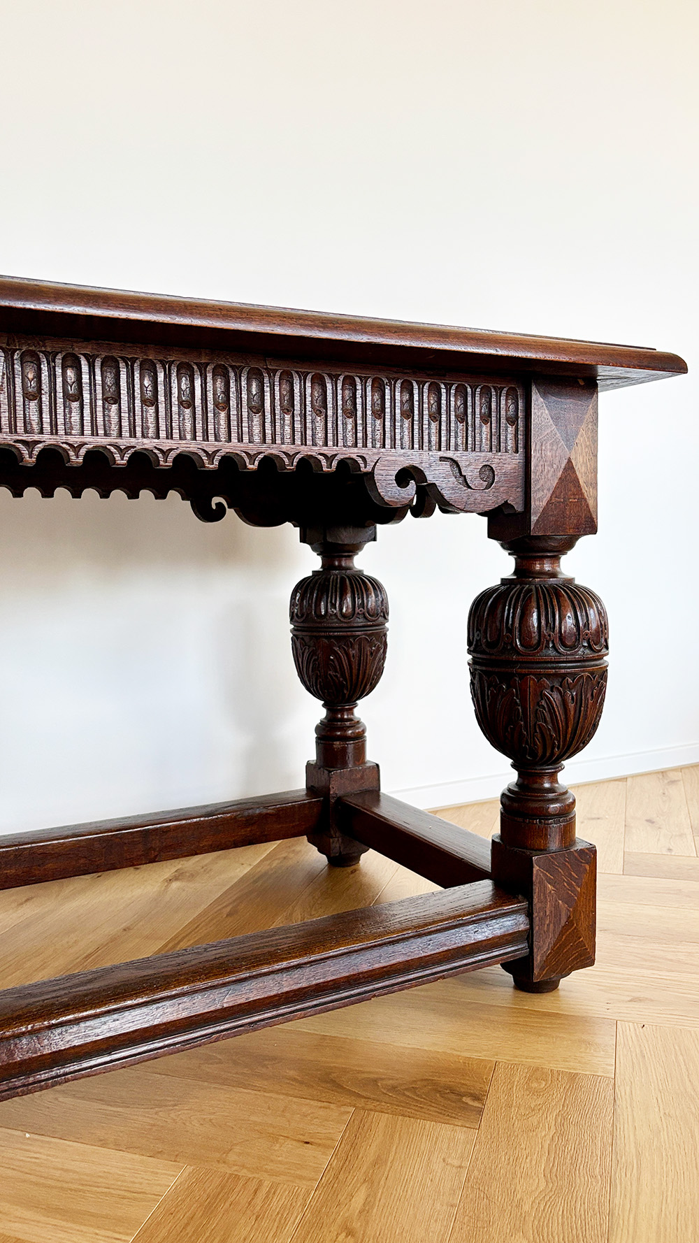 Table in the Renaissance Revival style, dating from the mid-to-late 19th century. Likely of French or Northern European origin, it is crafted in dark-stained oak with a richly carved apron and baluster legs featuring fluted and foliate motifs. The design reflects the 16th-century Renaissance influence, reinterpreted during the historicist movement of the 1800s. A well-proportioned piece with strong decorative presence, ideal as a side or hall table.
