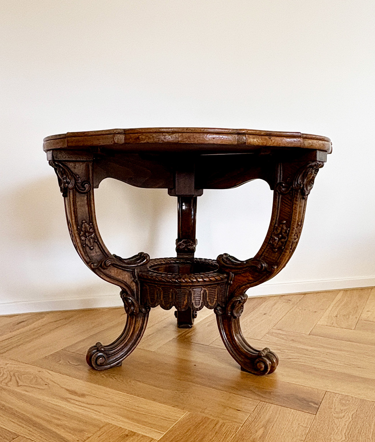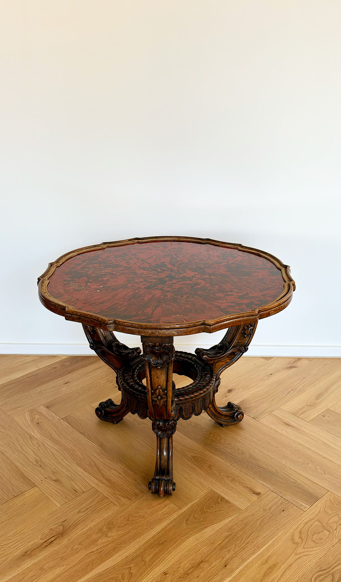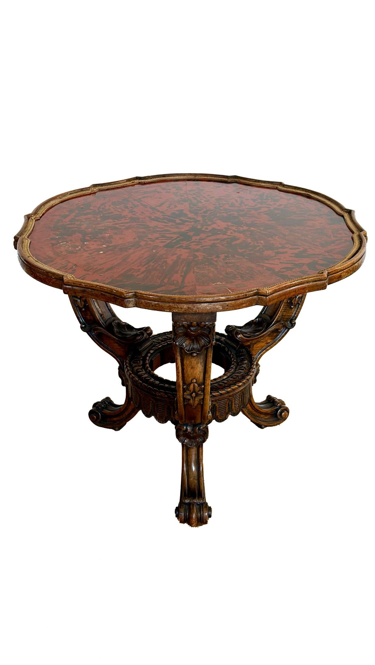 Circular table with a reddish tortoiseshell veneered top, bordered by a gilt-bronze rim. The carved walnut base is supported by elegantly scrolling legs, with a decorative garlanded stretcher, complementing the scalloped surface. Likely French or Italian, c. 1850–1880.